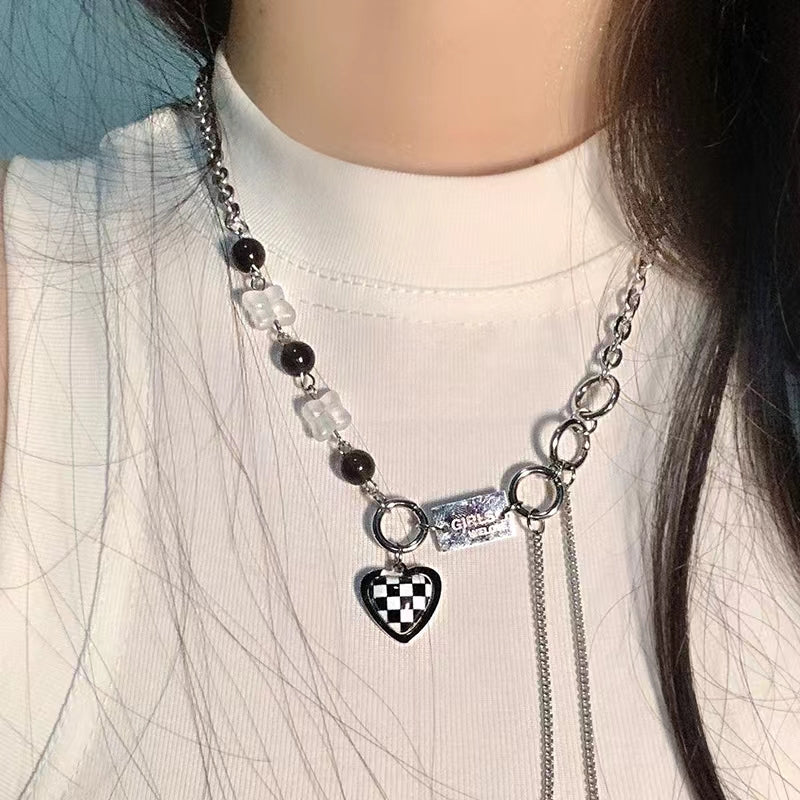 Black and white checkerboard checkerboard love zirconia tassel chain necklace