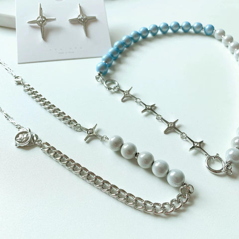 Reflective blue and white pearl cross patchwork necklace