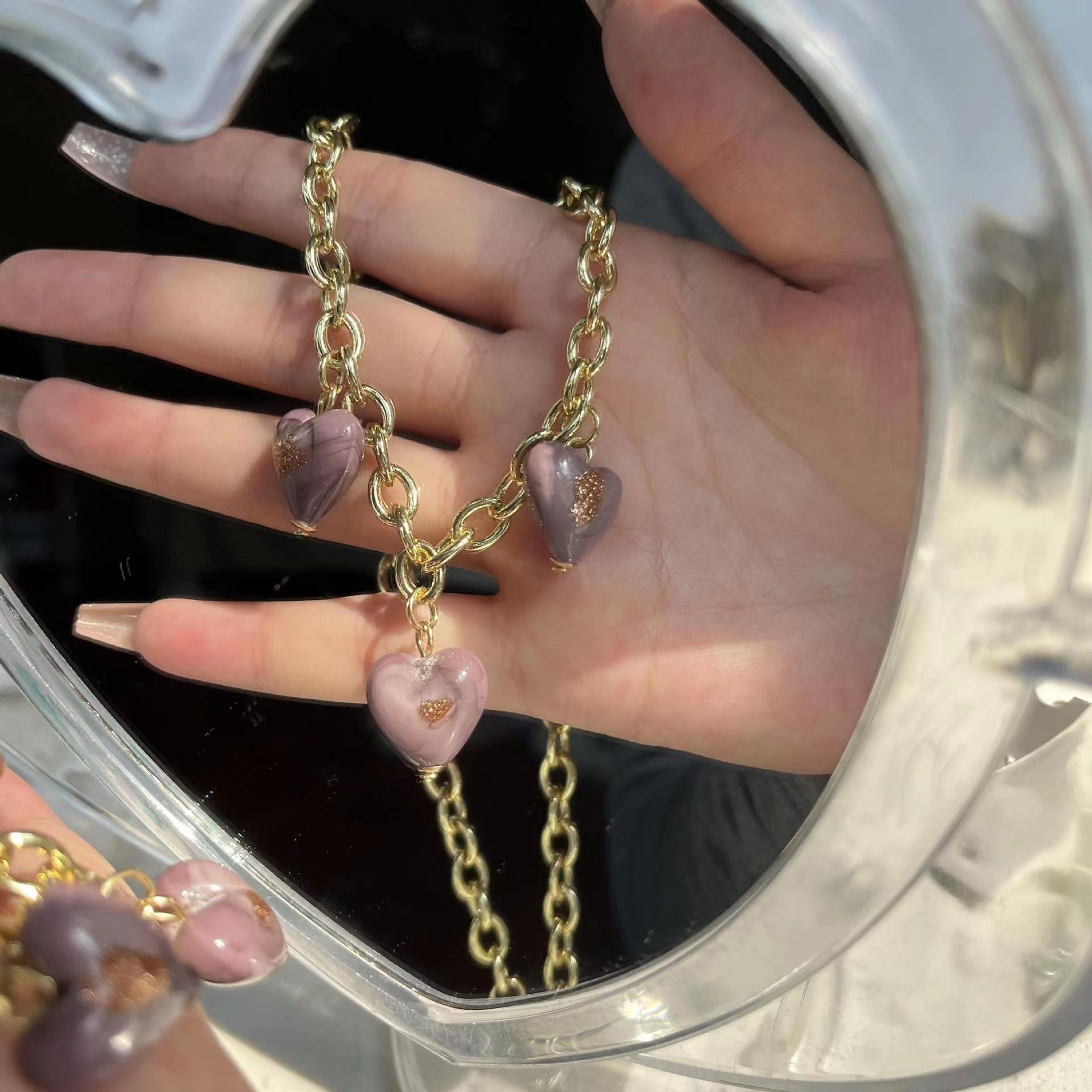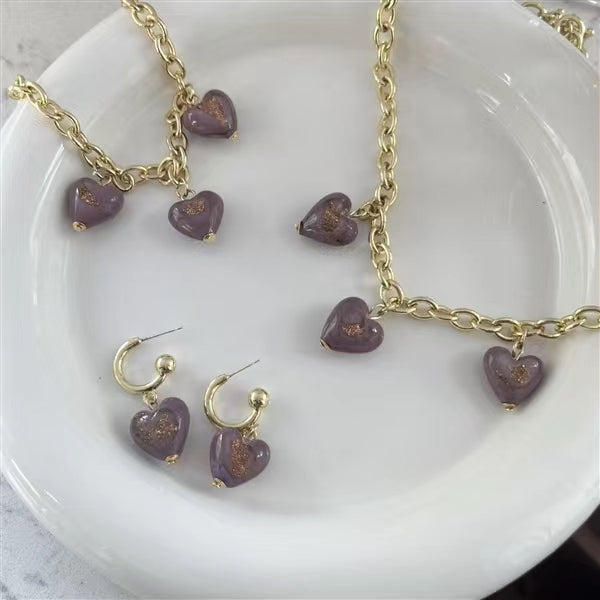 violet glazed gold foil Love Pendant Necklace French retro light luxury Earrings Bracelet Set