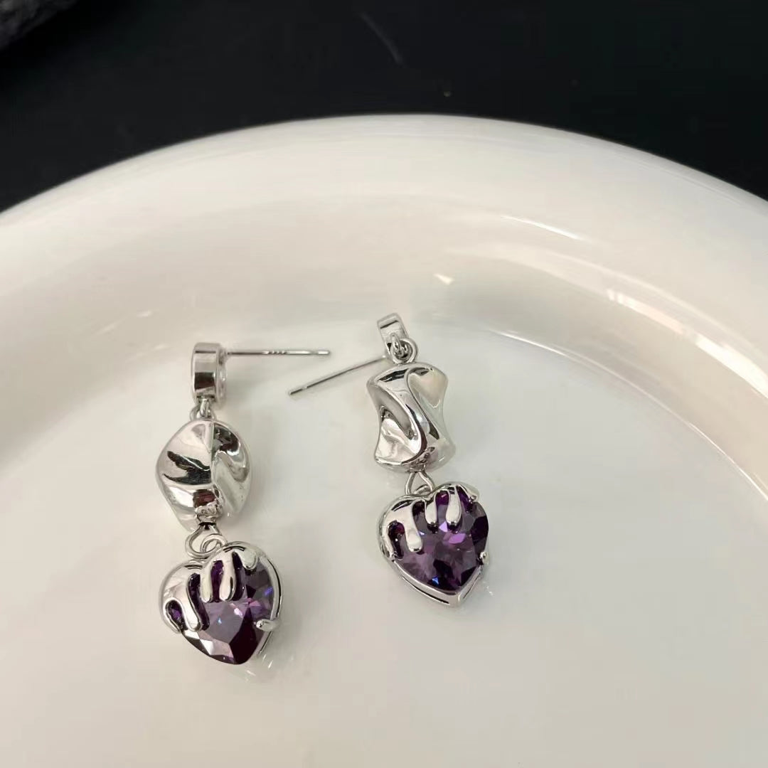 Retro droplets purple crystal love earrings ins cold wind Europe and the United States niche design earrings female tide