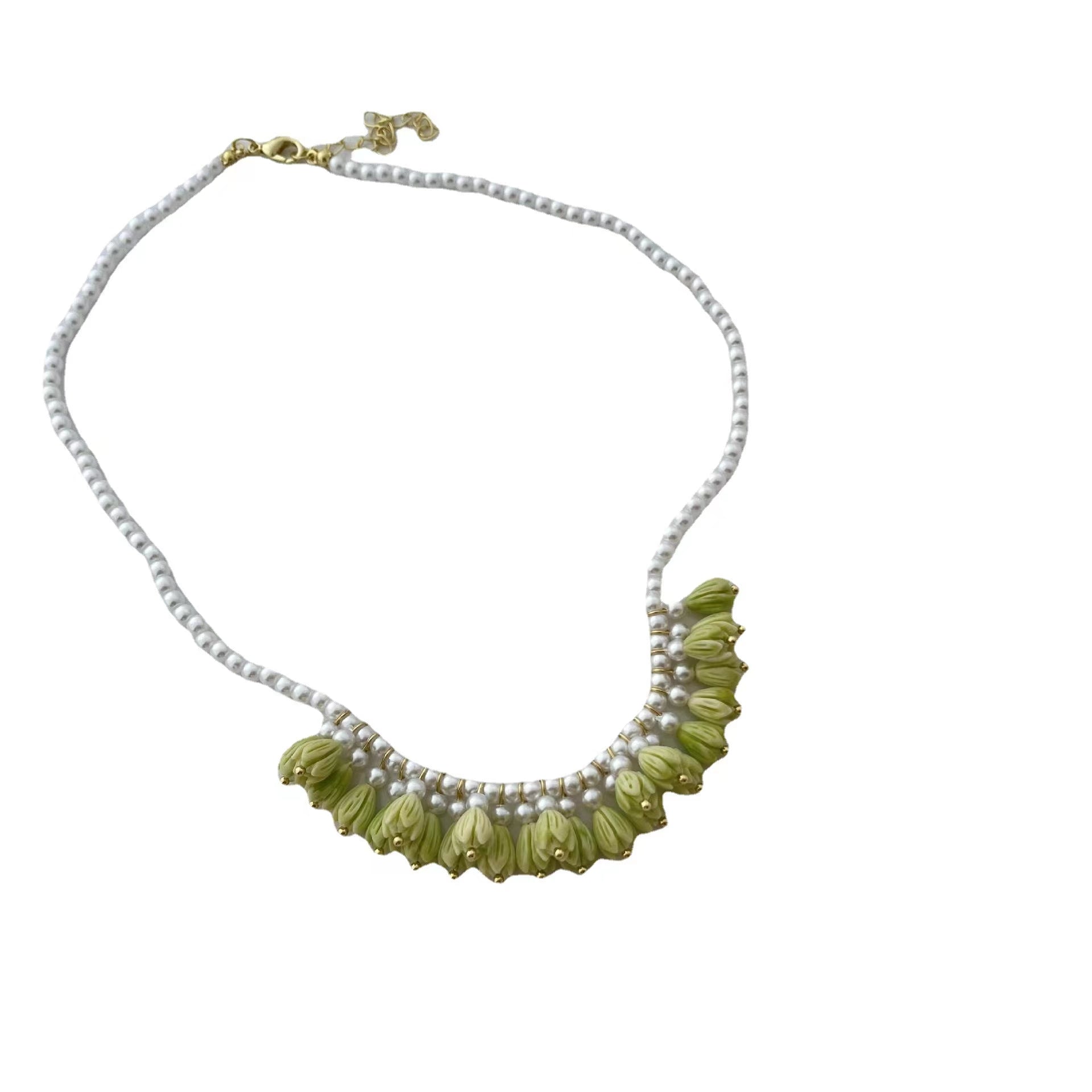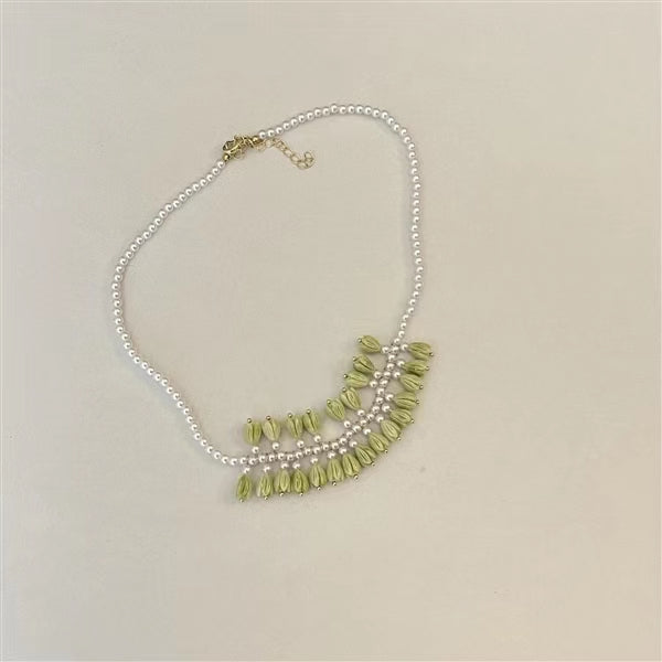 Vintage Green tulip bud hand made pearl light luxury collar chain female cold wind neck chain necklace