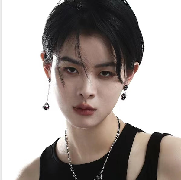 Black Imitation Tourmaline Asymmetrical Earrings Female Metal Lava Small Design New Silver