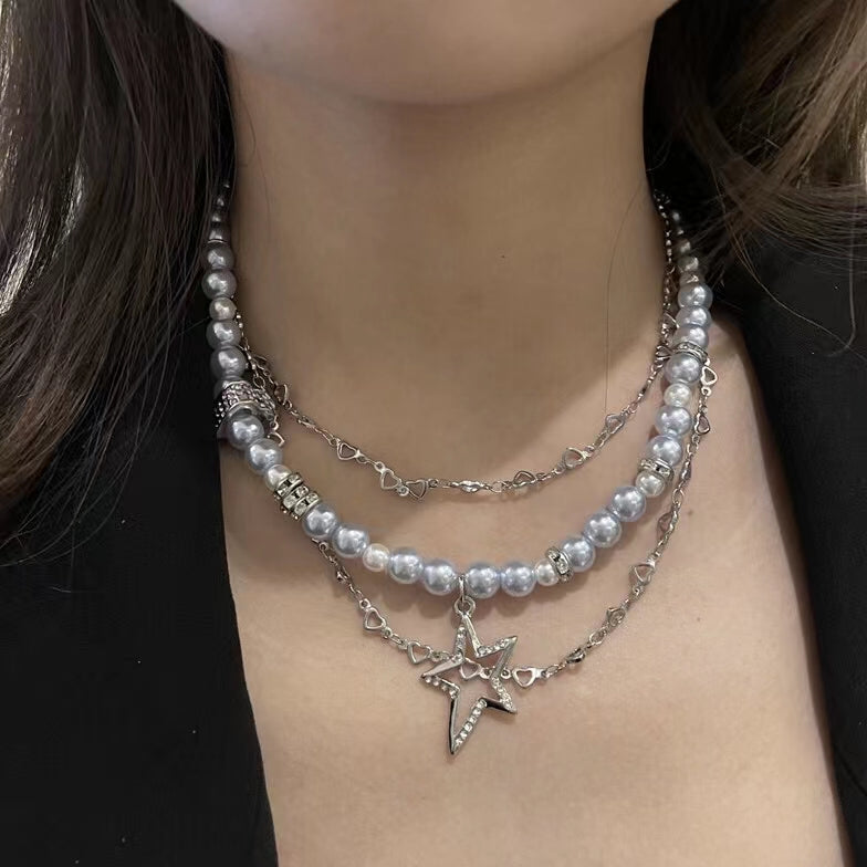 Multi layered stacked small collarbone chain, blue pearl, love diamond, Five Star Pendant