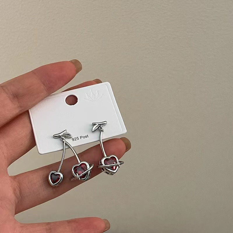 925 silver pin burgundy zirconia love Cheerios earrings niche design sense cold wind earrings ins sweet earrings