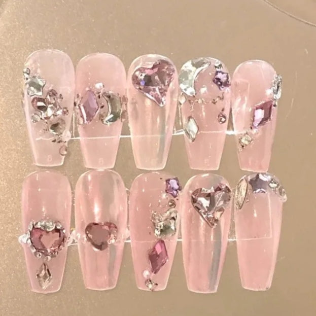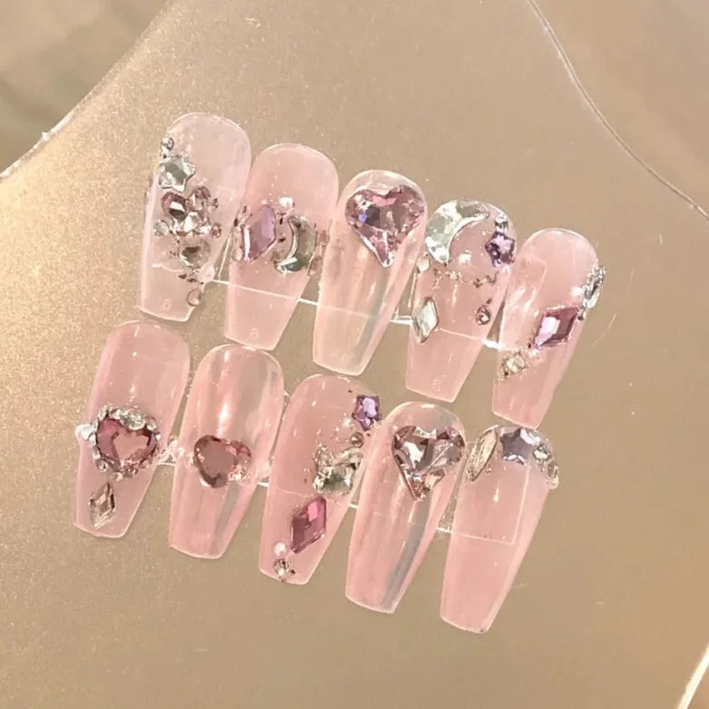 Artificial nails are worn by hand, showing white and pink French flash diamond rose lovers' manicure wedding nails are removable