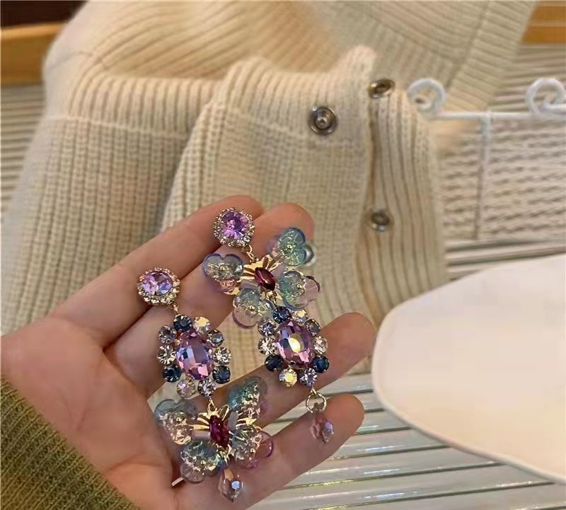 Vintage asymmetric purple flowers butterfly long earrings