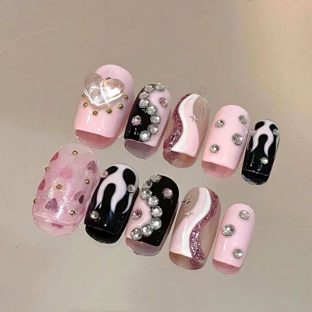 Sweet Cool Hottie Pink Tai Chi Flame Nail Crushed Diamond Nail Art 2K Short Hand Painted Wearable Nail Barbie Pink Trend