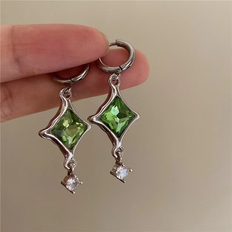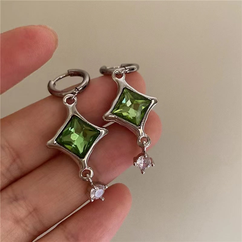 Hip-hop personality sweet cool spicy girl accessories fashion green crystal earrings niche silver earrings temperament Netflix earrings