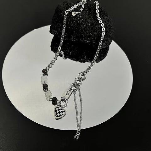 Black and white checkerboard checkerboard love zirconia tassel chain necklace