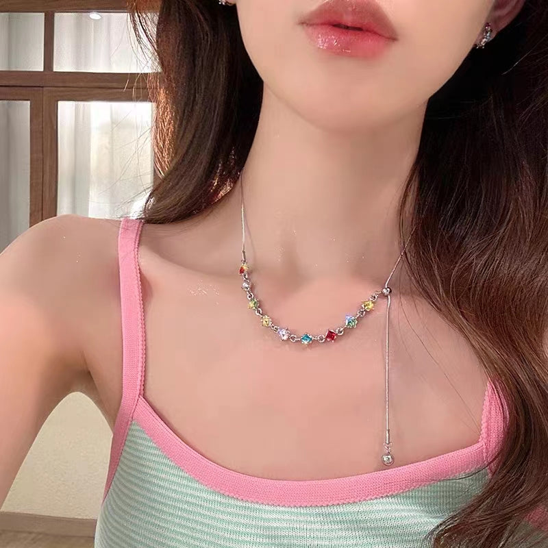 Rainbow Crushed Stone Necklace Light Luxury Small Crowd 2023 New Adjustable Collar Chain with Advanced Sense Sweet Neckchain Women's Trend