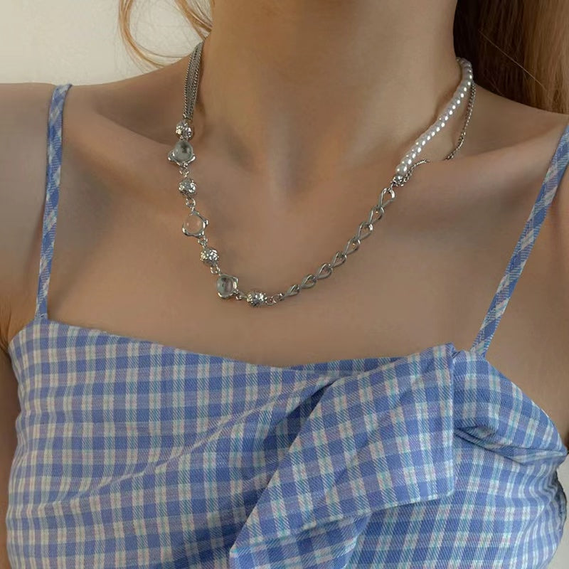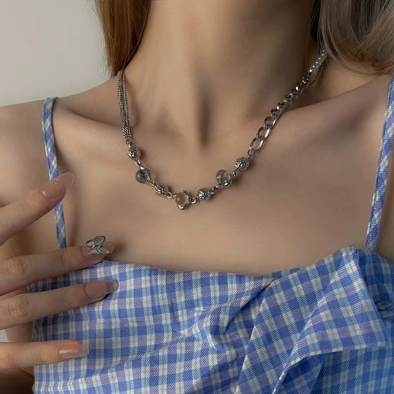 Sweet cool personality round bead splicing pearl necklace female light luxury niche ins hip-hop cold wind design sense collarbone chain