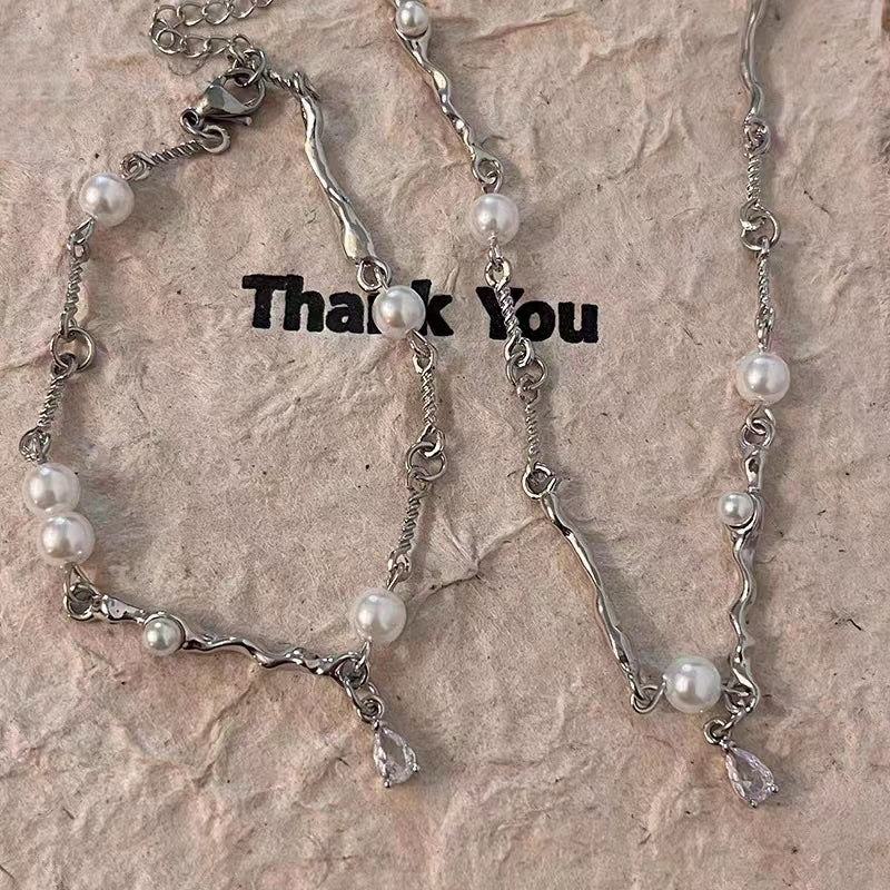 Wave pleated pink diamond bow pearl necklace women's ins sweet and spicy Y2K niche design collarbone chain